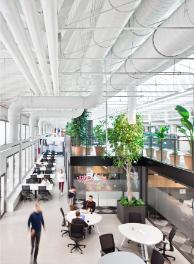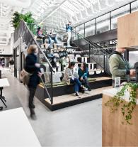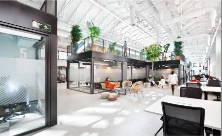 The metal structure of the gabled roof and the large longitudinal skylight along the warehouse are present at a height of 15 m or 50 ft, and make the various adaptable and flexible workplaces stand out. Spaces where innovation and creativity is in the air. A 1,900 m² or 20,440 ft2 space where private offices sit side by side with fixed stations and enclosed meeting rooms, open-plan areas with freely available workstations, or spaces complete with bleachers available to hold conferences and presentations.