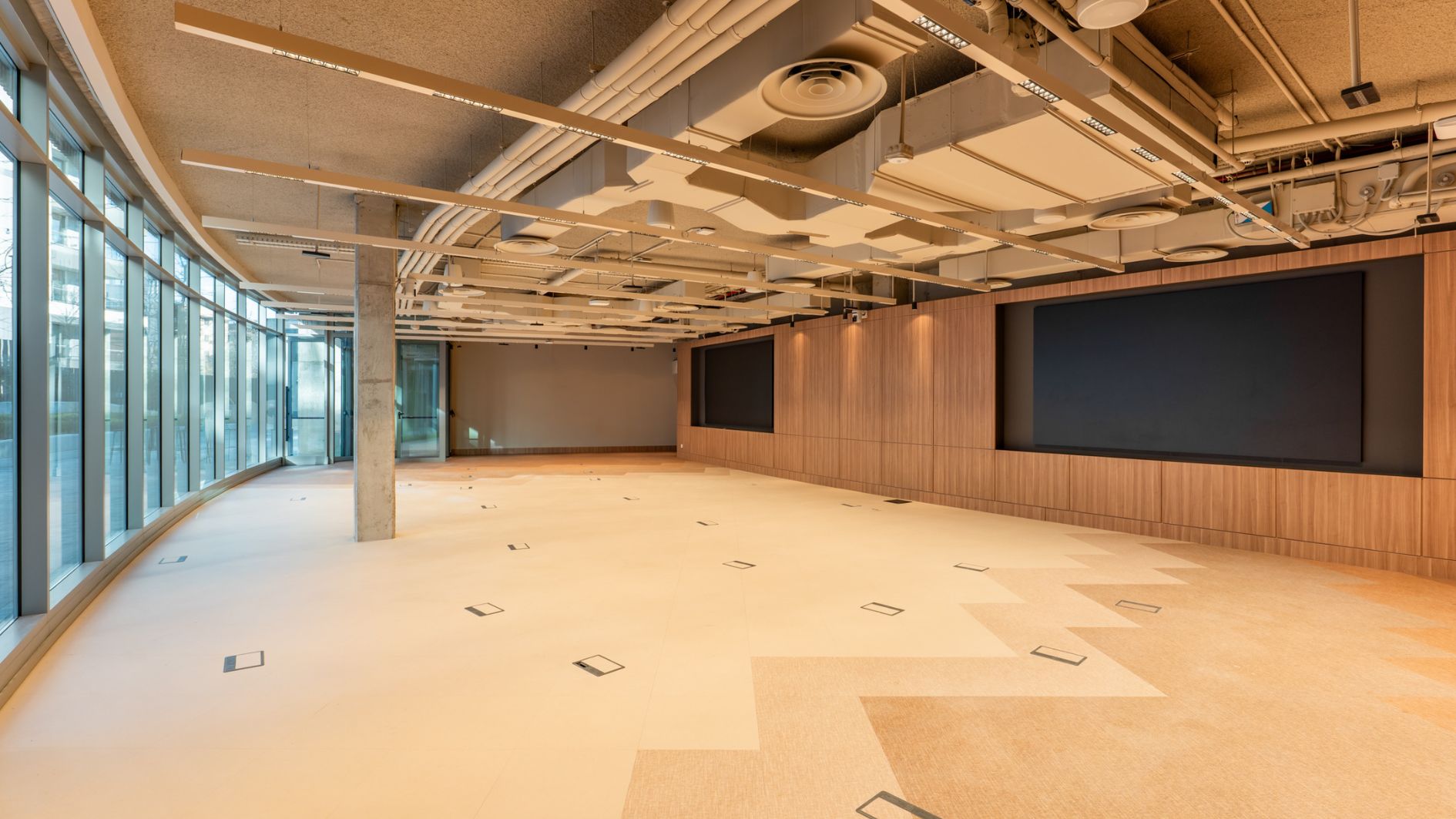 The solution was implemented as a comprehensive interior architecture project: new partitioning using walls and linings, integration of glazed partitions and joinery, definition of suspended ceilings with their access points and junctions, and execution of flooring and finishes (paints, cladding, and trims) designed for intensive use and a refined aesthetic. Simultaneously, the commissioning and deployment of the necessary building services for the space's operation was addressed: HVAC, electrical and lighting, voice and data, fire protection, and security/CCTV systems, ensuring their coordination with the architecture (passageways, access points, return lines, support structures, and accessibility for maintenance).