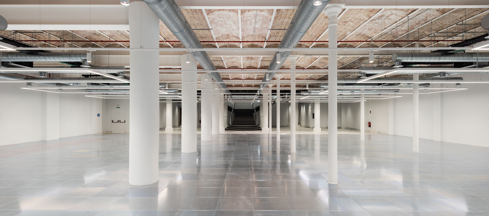 In the ground and basement floors, the intervention is mixed, with the restoration of white marble flooring and the installation of raised flooring in the large room corresponding to the inner block. The plaster and fireproofing on the ceilings have been chipped away to expose the original mahogany, restoring degraded areas. Subsequently, metal beams have been fireproofed with paint, and mahogany rounds have been fixed and waterproofed between joists. Cast iron pillars have been fireproofed, giving the space an industrial look characteristic of the early 20th century. Additionally, the skylight has been renewed.