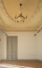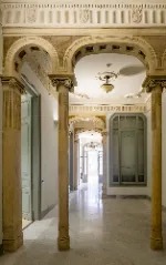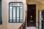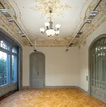 The restoration of common areas involves repairing, cleaning, and waxing the fire-resistant lime stucco in the courtyard and the main stairwell, stripping the lobby and ceiling cladding to reveal the original finish, restoring the historic elevator, and adapting the wooden cabin doors from swinging to sliding. On the main floor, existing hydraulic tile flooring with borders is restored, as well as the wooden slat park. Doors, glass, and existing partitions are restored, and plaster ceilings with cornices and reliefs are stripped, exposing decorations with gold leaf in rooms where the original false ceiling did not exist. Cornices have been recomposed by cloning the molds of the existing ones.