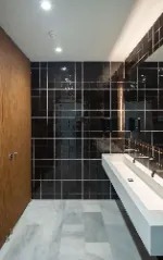 On the standard floors (P1, P2, and P3), open-plan spaces are equipped with new bathroom cores, raised flooring, and perforated metal false ceilings with integrated lighting and emergency fixtures. New automatic sliding glass doors are installed.